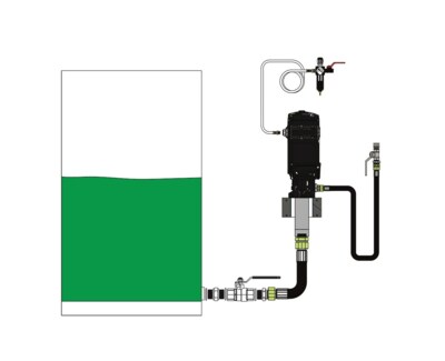Komponenten für eine bodenmontierte, druckluftbetriebene Ölpumpe mit Saugschlauch für Tankanschluss.