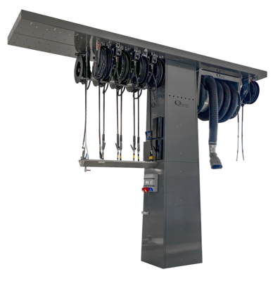 Der Serviceturm kann mit verschiedenen Produkten ausgerüstet werden. Einzel-Servicecenter für Öl-, Fett-, Frostschutz., Luft- und Abgas- System. Für bis zu 16 Schlauchufroller.