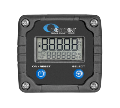 Equipped with current dispense display and resettable trip meter and non-resettable totalisors. Digital display powered by two 1,5 V AAA batteries. Accuracy +/- 2 %. Can be calibrated.