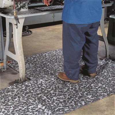 Spill Rug. Absorbs most industrial liquids (oil-based as well as water-based). Spunbond on one side gives superior strength. Spunbond material allows for high abrasion resistance when used in high traffic areas. All rolls are perforated twice down the center as well as across the width thus minimizing waste. Camouflage pattern masks stains and keeps floor looking clean. Thick outer spunbond layer makes product extra resistant. Perforated down center as well as across width.