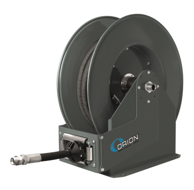 Open slanghaspel met grote oprolcapaciteit voor olie en perslucht. Alle slangen zijn uitgerust met geperste koppelingen.