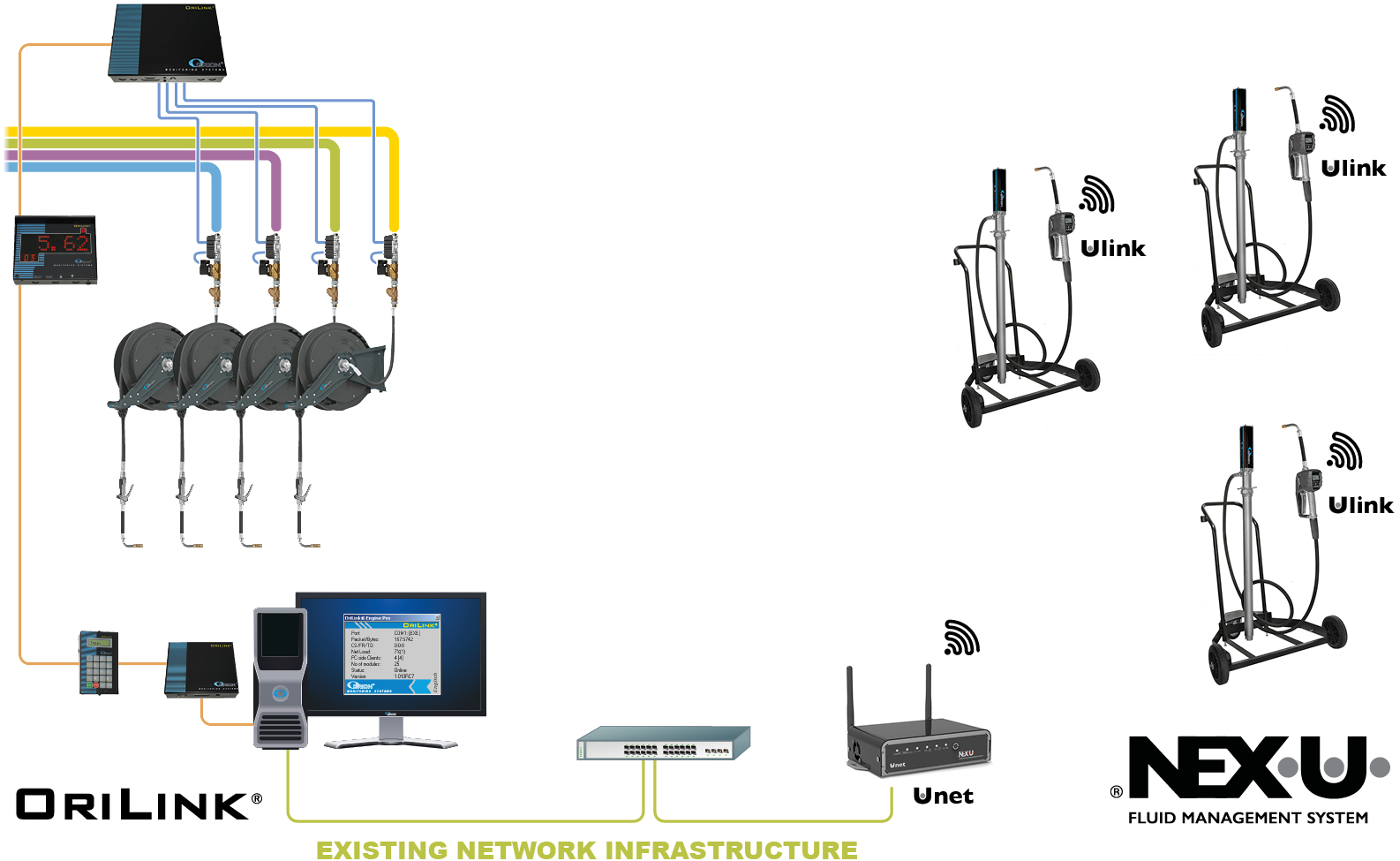 To connect the mobile unit, a NEX·U·® U·net is connected to the same network. To perform the actual dispensing, a NEX·U·® U·link wireless digital hand meter is used.