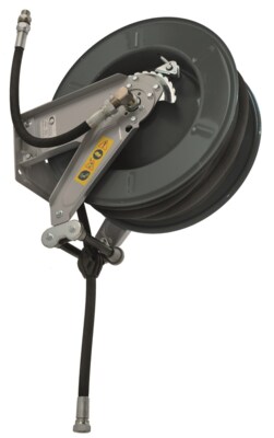 Открытая катушка судлиненными шлангами длямасла, смазки, воздуха,воды и др. При креплении наперекрытии направляющаяшланга должна задаватьправильное направлениешлангу. Все шланги имеютзапрессованные резьбовыесоединения.
