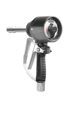 Очень прочный, устанавливаемый на конце шланга счетчик с поршнем роторного типа, включающий поворотное соединение, рукоятку пистолета, сетчатый фильтр грубой очистки на входе, выпускной шланг и