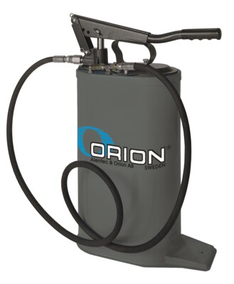 Oval stålbehållare med bärhandtag, högtrycksslang och hydrauliskt munstycke. Vikt 9,15 kg.