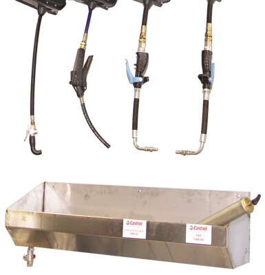 Placeras under slangupprullare för att förhindra vätskor att droppa på golvet. Tillverkad i rostfri plåt.